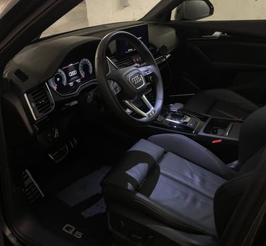The interior of a car with a dashboard and steering wheel